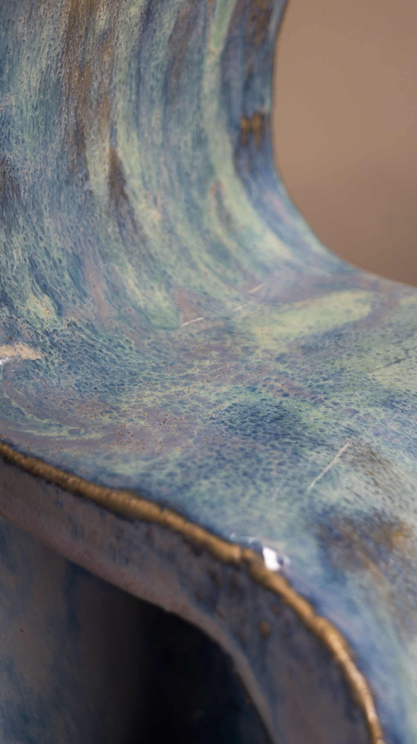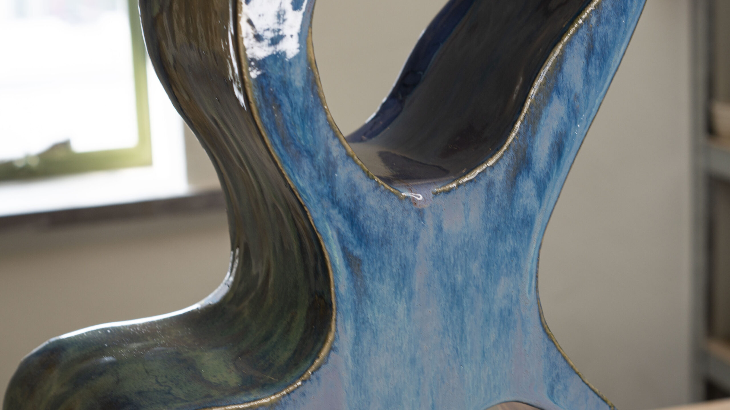 Dit sculptuur, “Purple Storm”, is geïnspireerd op de vloeiende en organische vormen die in de natuur voorkomen. De golvende lijnen en open structuren roepen natuurlijke elementen op zoals water, wind en door de tijd gevormde rotsformaties. Het werken met steengoed stelt mij in staat de robuustheid van de natuur vast te leggen, terwijl het glazuurproces een eigen leven leidt. Het blauwe en paarse glazuur verspreidt zich onvoorspelbaar over de vorm, net zoals de natuur haar eigen weg kiest. De invloed van natuurlijke processen en het loslaten van controle tijdens het glazuren benadrukken de verbinding tussen het organische en het toevallige.